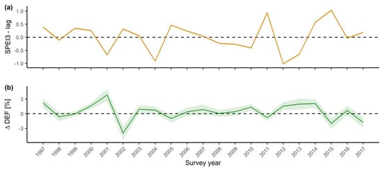 Inverse relationship between previous year SPEI (Standardized Precipitation Evapotranspiration Index) and defoliation change (ΔDEFi) in Croatia from 1996–2017. (a) Previous year mean SPEI (orange line) and standard error (orange area), calculated on a time scale of three months. (b) Annual overall defoliation change (ΔDEFi) mean (green line) and standard error (green area).