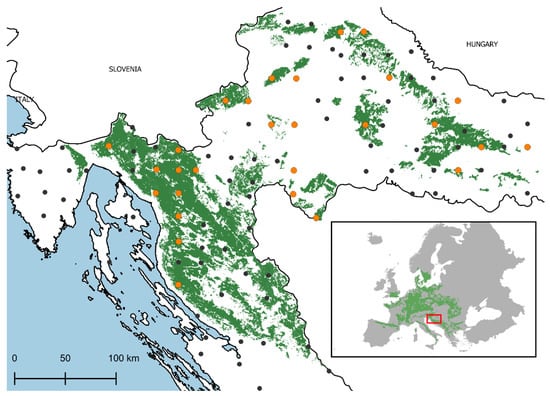 Location of research plots in the context of the distribution of European beech in Europe [66]. Selected Level I ICP Forests monitoring plots (orange dots); remaining Level I plots in Croatian (black dots); distribution of European beech forests in Croatia [67] (green polygon).