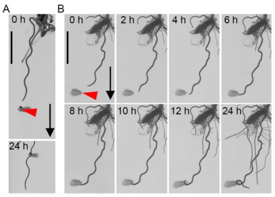 - Takahashi, N.; Yamazaki, Y.; Kobayashi, A.; Higashitani, A.; Takahashi, H. Hydrotropism interacts with gravitropism by degrading amyloplasts in seedling roots of Arabidopsis and radish. Plant Physiol. 2003, 132, 805–810. [Google Scholar] [CrossRef] [PubMed]