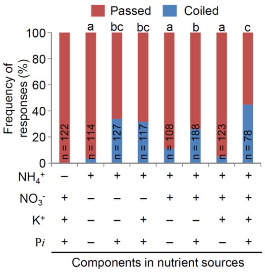 Nutritropic responses of the main root (passed or coiled) of WRC 25 to the components of the nutrient sources. The frequencies of passed and coiled responses were determined in the nutritropic bioassay with nutrient sources containing various nutrient combinations of NH4+, NO3−, K+, and/or Pi at 200 mM. Statistical significance was tested using Fisher’s exact test with multiple testing corrections (Holm correction). Different letters on the bars indicate a significant difference at p < 0.05.
