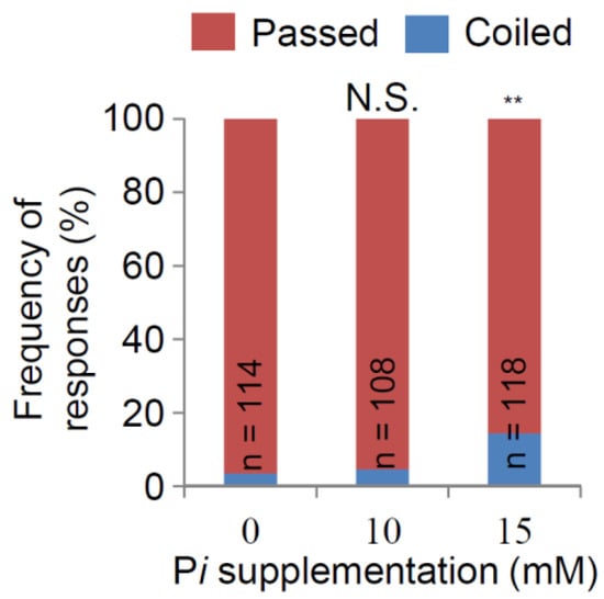 Increase in the nutritropic response of the main root (passed or coiled) of WRC 25 to NH4+ in the Pi-supplemented culture medium. Frequencies of the passed and coiled responses were determined in the nutritropic bioassay with a 200 mM NH4+ nutrient source. Data of 0 mM Pi were the same as those in Figure 2. The statistical significance was tested using Fisher’s exact test. N.S., not significant; **, p < 0.01.