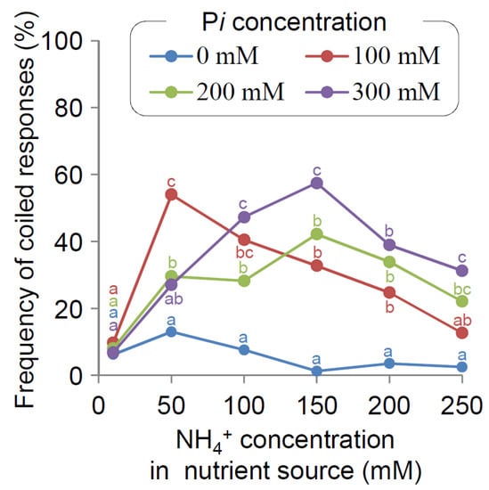 Effect of the interaction of NH4+ and Pi on the nutritropic response of the main roots of WRC 25. Frequencies of the coiled responses in the main roots of WRC 25 were determined in the nutritropic bioassays (n = 71–181 per each condition) with nutrient sources containing NH4+ and Pi at the indicated concentrations. Data of 200 mM NH4+ and 200 mM Pi were the same as those in Figure 2. Statistical significance among conditions at the same concentrations of NH4+ was tested using Fisher’s exact test with multiple testing corrections (Holm correction). Different letters indicate a significant difference at p < 0.05.