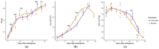 I. pumila plants from the burned and unburned sites significantly differed by growth parameters throughout the whole season. The seasonal pattern of growth parameters was similar, with maximum Wt in the middle of the growing season, while LAI gradually increased and SLA gradually decreased as the growing season progressed (Figure 4a–c). Values of all growth parameters differed significantly in nearly all sampling dates. Plants from the burned site had higher Wt, lower LAI, and lower SLA.