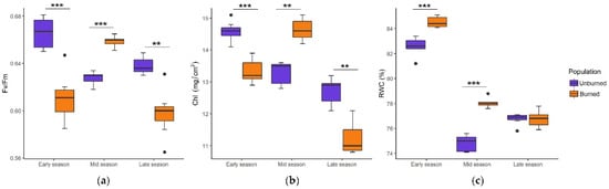 Seasonal dynamics of photosynthetic efficiency (Fv/Fm) (a), chlorophyll amount (Chl, mg/cm2) (b), and relative leaf water content (RWC, %) (c) in C. reticulatus plants from unburned and burned sites. Boxplots represent the median value (bar) within the interquartile range, IQR (colored rectangle), the range between minimum and maximum value that are at the maximal distance 1.5 × IQR from the first and third quartile, respectively (whiskers) and the outliers (black dots). Statistically significant differences are indicated with asterisks, ** p < 0.01, *** p < 0.001.