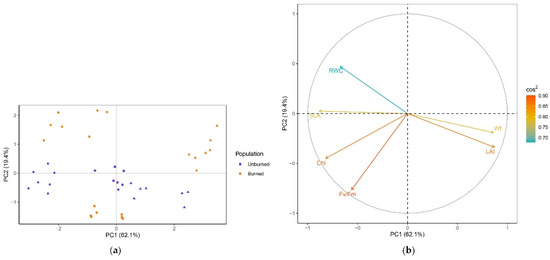 (a) PCA separation of C. reticulatus individuals in the plane of the first two axes. Individuals are colored by population (unburned site, population I, violet; burned site, population II, orange) and marked with a season symbol (early season, dot; mid-season, square; late season, triangle). (b) Loading plot with the structure of the six variables (plant traits) in the plane of the first two axes. The contribution of plant traits to the separation of individuals is indicated by the eigenvector scores (cos2).
