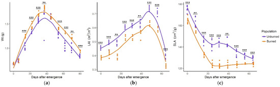 Seasonal dynamics of Wt (total plant weight, g) (a), LAI (leaf area index, m2/m2) (b), and SLA (specific leaf area, cm2/g) (c) in I. pumila plants from unburned and burned sites. Statistically significant differences are indicated with asterisks, ** p < 0.01, *** p < 0.001.