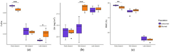 The values of ecophysiological traits and their seasonal tendencies in plants from burned and unburned sites differed significantly throughout the growing season (Figure 2a–c). Fv/Fm and Chl were at the highest level in the unburned population in the early season, but in the burned population, they reached a maximum in the mid-season. RWC showed a similar seasonal dynamic, although it was higher in the burned population.