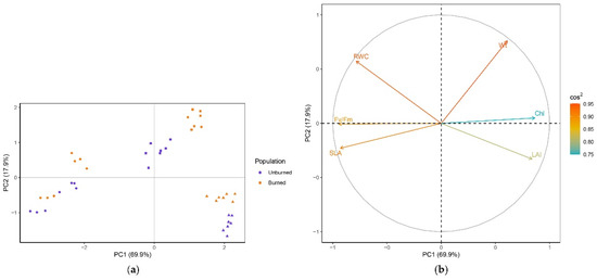 (a) PCA separation of I. pumila individuals in the plane of the first two axes. Individuals are colored by population (unburned site, population I, violet; burned site, population II, orange) and marked with a season symbol (early season, dot; mid-season, square; late season, triangle). (b) Loading plot with the structure of the six variables (plant traits) in the plane of the first two axes. The contribution of plant traits to the separation of individuals is indicated by the eigenvector scores (cos2).