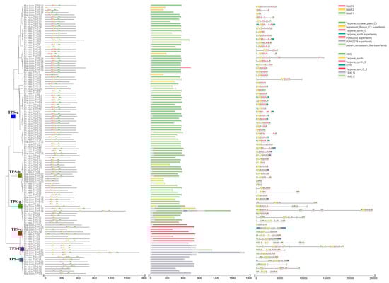 Phylogenetic relationship and distribution of motif/domain of TPSs in three Rosaceae species (P. persica, M. domestica, F. vesca). The phylogenetic tree is shown on the left panel, while conserved motifs, conserved domains, and Pfam domains are shown on the right three panels. The phylogenetic tree from full-length amino acid sequences was constructed using the MEGA with maximum likelihood (ML) method. The conserved motifs were assessed using the online MEME software. The conserved domain was annotated based on the conserved domain database in NCBI, whereas the gene structure and domains were annotated by using the PfamScan tool. The conserved motifs and domains are shaded in different colors. The root nodes of TPS-a, TPS-g, TPS-b, TPS-c, TPS-e, and TPS-f clades are indicated by blue, green, yellow-green, red, benzo, and purple, respectively.