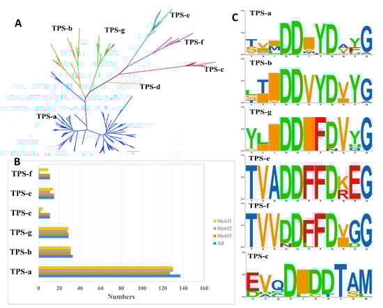 Terpenoids represent the largest group of natural products and make up diverse secondary metabolites. Terpenoid composition not only represents a critical attribute in determining the quality of horticultural food products, such as taste and aroma, but also functions widely in plant development and defense, such as attracting pollinators, defending against herbivores, and acting as anti-bacterial agents [8,9,10]. Plant terpenoids (isoprene-C5, monoterpenes-C10, sesquiterpenes-C15, diterpenes-C20, and polyterpenoids-C5xn) are some compounds derived from isomeric 5-carbon building blocks isopentenyl diphosphate (IPP) and dimethylallyl diphosphate (DMAPP) [11,12]. About 50,000 terpenoid metabolites including monoterpenes, sesquiterpenes, and diterpenes have been identified in higher plants, liverworts, and fungi [11,12]. In general, for a better adaptation to a local ecological niche, each species typically synthesizes only a small fraction of terpenoid metabolites [9,13]. In plants, geranyl diphosphate (GPP), farnesyl diphosphate (FPP), and geranylgeranyl diphosphate (GGPP) are the precursors for monoterpenes, sesquiterpenes, and diterpenes, respectively; terpene synthase genes (TPSs) are responsible for converting them into a multitude of cyclic and acyclic terpenoids [12]. The characteristic catalytic function of TPSs is to generate multiple terpenoid products using one substrate, thus collectively contributing to numerous different structures of plant terpenoids in addition to modifying enzymes [12]. Generally, the TPS family is characterized by two large domains including the N-terminal domain (PF01397) and the C-terminal metal cofactor binding domain (PF03936) [14]. The N-terminal domain possesses a conserved RRX8W (R, arginine, W, tryptophan, and X, alternative amino acid) motif and the C-terminal domain contains two highly conserved aspartate-rich motifs, the DDxxD motif and the NSE/DTE motif. The DDxxD motif is involved in the coordination of divalent ion(s), water molecules, and the stabilization of the active site, and is found among all functional TPSs [3]. The NSE/DTE motif flanks the entrance of the active site and function in binding a trinuclear magnesium cluster [14,15]. TPSs are split into seven subgroups based on their amino acid sequence relatedness, namely TPS a-g. The majority of TPSs in most plants fall into one or two clades and the TPS-d clade was only encoded in gymnosperms [15,16]. Different TPS clades differ considerably in catalysate and sequence. As the largest clade, the TPS-a clade mainly encodes sesquiterpenes. TPS-b and TPS-g clades are clustered closely to TPS-a; the TPS-b clade contains the conserved R(R)X8W motif and usually encodes monoterpenes, while the TPS-g clade lacks the conserved R(R)X8W motif, and functions in producing mono- and sesquiterpenes [17]. The TPS-c clade is characterized by the “DXDD” motif but not the “DDXXD” that was detected in other clades, and mainly functions in producing diterpene products [17]. The TPS-d clade is only encoded in gymnosperms, and function in producing mono- and sesquiterpene products. The TPS-e/f clades are clustered closely, and mainly encode diterpene products [17]. TPS-a/b clades lack the N-terminal γ domain characteristic of diterpene synthases found in clades c, e, and f. In general, the biosynthesis of isoprene, monoterpenes, and diterpenes occurs in the plastid and the biosynthesis of sesquiterpenes occurs in the cytosol [17].