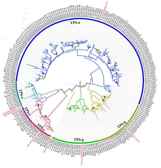 To explore the evolution of TPSs in Rosaceae, we chose two representative species from each subfamily in Rosaceae for phylogenetic tree construction, including two Prunoideae species (P. persica, P. mume), two Maloideae species (M. domestica, P. betulifolia), and two Rosoideae species (F. vesca, R. chinensis). The detailed distribution of family numbers of different TPS clades is listed in Table 2. The TPS-a clade is the major determinant of family size of individual species; it is the largest group with more TPS copies, followed by TPS-b and TPS-g, TPS-c/e/f have a relatively small family size. On the whole, Rosoideae species owned more TPS copies, followed by Maloideae species, and Prunoideae species. The family number of TPSs from R. chinensis is up to 57, of which 37 are TPS-a members. The six Rosaceae species that we chose nearly contained all five TPS clades; however, no TPS-f member was detected in F. vesca. The family number distribution of different TPS clades also varied among three Rosaceae subfamilies. For example, more than two TPS-c gene copies existed in the Maloideae and Rosoideae subfamilies, while only one copy was detected in Prunoideae species. The diversity of family number of TPS-f is also obvious; both M. domestica and P. betulifolia owned three copies, while for Rosoideae species, only one copy was encoded in R. chinensis. For Prunoideae species, one copy of TPSs from the TPS-f clade was detected in P. mira and P. mume, while three copies were detected in P. persica, indicating the recent expansion of the TPS-f clade in modern peach. The phylogenetic relationship revealed that lineage-specific expansions of the TPSs were widely observed within different TPS clades. These expansions are denoted in the phylogenetic tree (Figure 3 and Figure S2), the clustering relationship indicated that many expansions occurred after the split of sister lineages, such as the split of Maloideae and Prunoideae. Two Rosoideae species (F. vesca, R. chinensis) owned more lineage-specific expansions compared with the other two Rosaceae subfamilies, especially in the branch of TPS-a clade. On the other hand, in the lineage-specific expansion branch, except that many copies were shared by sister species, species-specific expansions were also detected widely. R. chinensis was also the most striking species with more copies of TPSs arising by species-specific expansion.