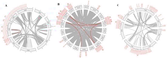 Inter-chromosomal relationships of TPSs in P. persica (A), M. domestica (B), and F. vesca (C). Grey lines in the circle indicate the collinear blocks in the P. persica or M. domestica genome. The red lines in the circle highlight the segmental duplicated TPS gene pairs, while the red curve outside the circle indicates the tandemly duplicated TPS gene pairs produced by MCSscanX.