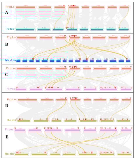 Synteny analysis of TPSs among Rosaceae species. Grey lines in the background indicate the collinear blocks between different genomes, while the yellow lines highlight the syntenic TPS gene pairs. The chromosome is indicated by different colored boxes and labeled by Pr.pLo (P. persica), Pr. Mir (P. mira), Ma.dom (M. domestica), Fr.ves (F. vesca), Ro.chi (R. chinensis). Collinear relationships between P. persica-P. mira, P. persica-M. domestica, P. persica-F. vesca, P. persica-R. chinensis, F. vesca-R. chinensis are shown in (A–E), respectively.