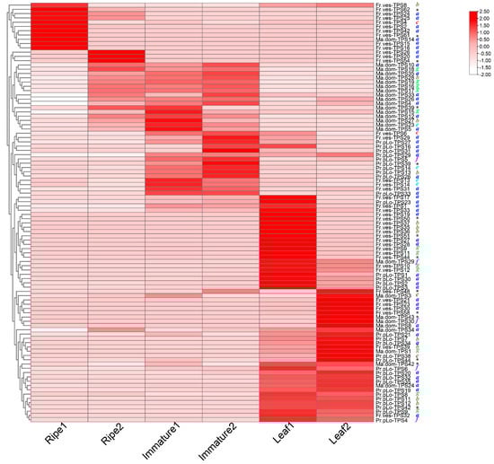 For the three representative plants (F. vesca, M. domestica, P. persica), RNA-seq data of different tissues and development stages (ripe fruit, immature fruit, leaf) was retrieved from the fruitENCODE project [37]; each tissue consisted of two replicates. The fruitENCODE project aims to generate a comprehensive annotation of functional elements in seven climacteric fruit species (apple, banana, melon, papaya, peach, pear, and tomato) with sequenced reference genomes. The data were deposited in the SRA database of NCBI with accession number PRJNA381300. Transcriptome analysis was implemented by the protocol in a previous study [38]. The clean reads of RNA-seq data from each sample were mapped against the genome reference with HISAT2 [39]; each SAM file was converted into a BAM file, and sorted. Duplicates were removed with SAMtools [40,41]. Further transcript assembly and quantification of the read alignments were performed using Stringtie [42]. Gene expression levels were measured by FPKM (fragments per kilobase of transcript per million mapped reads) and normalized with the row-scale method. Heatmaps with all samples were plotted using the “HeatMap” function in TBtools.