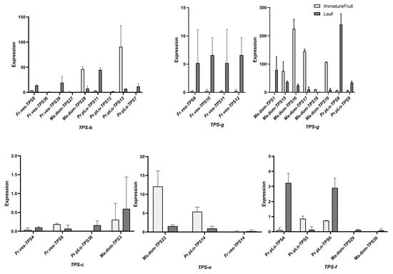 The expression level of TPSs from clades b, c, g, e, and f in the three Rosaceae species (P. persica, M. domestica, F. vesca). Tissues (immature fruit, leaf) are indicated by different colors.