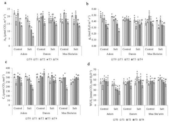 Weekly gas exchange measurements of the ecotypes Adom, Darom and Mea She’arim grown under control and saline conditions for 28 days. T0 = before the start of salt treatments; T1 and T2 = E.C. 3 dS m−1; T3 and T4 = E.C. 6 dS m−1. (a) AN = net assimilation rate, (b) gs = stomatal conductance rate, (c) Ci intercellular CO2 concentration, and (d) WUEi = intrinsic water use efficiency. Bars represent the means of five replicates with SE bars. Different letters represent significant differences among ecotype and treatment combinations for individual timepoints following a post hoc Tukey HSD with a significance level of p < 0.05.