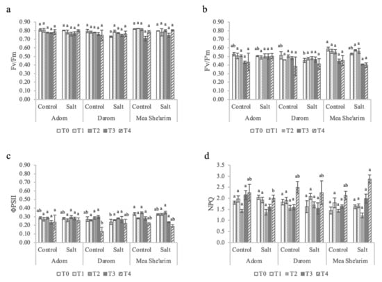 The effects of increasing salinity on photosystem II parameters. T0 = before the start of salt treatments; T1 and T2 = E.C. 3 dS m−1; T3 and T4 = E.C. 6 dS m−1. (a) Fv/Fm = dark-adapted maximum yield, (b) F′v/F′m = light-adapted efficiency of open reaction centers of PSII, (c) ϕPSII = light-adapted effective quantum yield, and (d) NPQ = non-photochemical quenching. Bars represent the means of five replicates with SE bars. Different letters represent significant differences among ecotype and treatment combinations for individual timepoints following a post hoc Tukey HSD with a significance level of p < 0.05.
