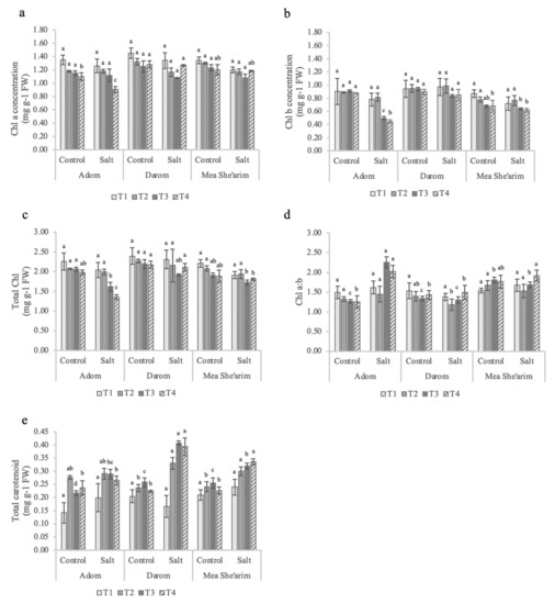 There were no significant differences in a, b or total chlorophyll concentrations under the low EC treatment (i.e., 3 dS m−1) among all three S. acmophylla ecotypes relative to the control (Figure 3). However, by the end of the first week at EC 6 dS m−1 (T3) the ecotypes demonstrated different responses to salinity, with Mea She’arim and Darom having a lower chl a concentration under salt stress compared with control and Adom (Figure 3a). By contrast, salinity did not significantly reduce either chl b (Figure 3b) or total chl (Figure 3c) concentrations in Mea She’arim or Darom, while it did negatively affect the same parameters in Adom. One additional week of treatment exacerbated these differences in response to salinity. As with the low EC treatment, there was no significant difference in chlorophyll (a, b and total) concentration in response to salinity in Mea She’arim and Darom, whereas Adom had a strong decrease in response to salinity. It is noteworthy that Darom had more total chlorophyll (2.20 mg g−1) compared to Mea She’arim (1.90 mg g−1) and Adom (1.92 mg g−1) throughout the trial. The significant increase in the chlorophyll a/b ratio observed in Adom starting at week three of the salt treatment and continuing to the end of the trial did not occur in either Darom or Mea She’arim (Figure 3d). The plant response to increasing salinity in terms of carotenoids depended very much on the accession (Figure 3e), with a significant main effect (p < 0.001; Table 1). Starting at T2, Mea She’arim and Darom had a general increase in total carotenoid concentration, while only slight and non-significant differences were observed in Adom. Mea She’arim had increases of 48.1%, 25.6%, and 24.4% in total carotenoids in response to salinity at the T2, T3 and T4 sampling points, respectively. Significant increases were observed in Darom as well, with salinity resulting in increased carotenoid concentrations of 76.1% (T2), 58.2% (T3) and 39.8% (T4) relative to control.