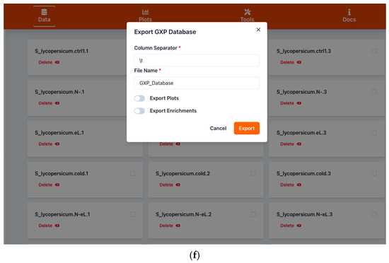 Screenshot images of Gene Expression Plotter (GXP) showing interfaces for data input. (a) shows the quantitative data table file import form, triggered by the first document button in the upper left panel. This form is used to load a quantification table such as the one shown in (b). (c) shows the transcript information table file import form, triggered by the second document icon in the left panel. This form is used to load an optional information table (see Section 1) like the one shown in (d). After successful import, the user can search for genes or their annotations in the “gene browser” (helix icon on the lower left panel). In the shown example, the user searched for “chalcone synthase”, a polyketide synthase involved in flavonoid biosynthesis. In (e) the user now inspects this gene’s expression quantifications (highlighted foreground) and additional information such as the logarithmic fold changes of gene expression assessed for various comparisons of control and stress treatments (lightly faded out background). Furthermore, as shown in (f), by using the GXP export function triggered by the fifth, upward arrow on the box icon in the left panel, GXP enables the user to save the current state, i.e., all imported data, generated plots, and analysis results for later continuation or to share it with other researchers.