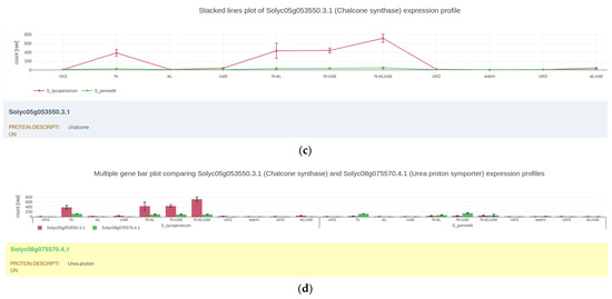 Screenshots of plots visualizing and comparing quantified gene expression between different treatments, experimental conditions, and genes: (a) bar plot, (b) individual lines plot and (c) stacked lines plot, are different modes of how Gene Expression Plotter (GXP) visualizes the expression profile of the example gene Solyc05g053550.3.1 (CHALCONE SYNTHASE). The three plots highlight how the expression of the example CHALCONE SYNTHASE responds to the experimental conditions. This CHALCONE SYNTHASE’s expression is up-regulated in S. lycopersicum but conversely not in S. pennellii following stress treatments of nitrogen deficiency (N-) and in combination with chilling temperatures (cold) and elevated light intensity (eL). Plot (d) compares the genetic response of this CHALCONE SYNTHASE with another gene of interest Solyc08g075570.4.1 (UREA PROTON SYMPORTER). In contrast to the expression of CHALCONE SYNTHASE, gene expression of the UREA PROTON SYMPORTER is relatively low in both S. pennellii and S. lycopersicum.
