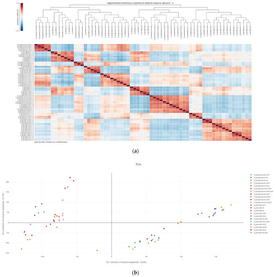 In GXP, a PCA can be carried out to identify and visualize likeliness between gene expression or metabolite concentrations of biological replicates (see Section 2.3.2). The principal component analysis is computed with the help of the ml-pca library (version 4.0.2; https://github.com/mljs; access date 11 January 2022). In this calculation, all data points are considered. The respective plot visualizing the first two principal components contributing most to the observed differences is created with plotly.js (version 2.6.3; https://plotly.com/javascript/; access date 11 January 2022).