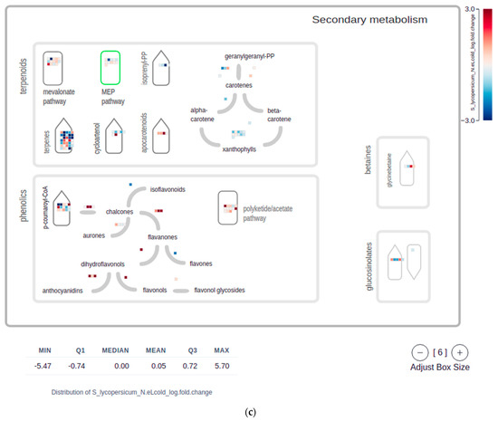 Screenshots of Mapman plots [1,2] used to visualize the genetic response to experimental stimuli in the form of metabolic sketches. Genes are mapped to areas in the sketches according to their molecular function. This gene function is directly extracted from the respective Mapman Bins [36] the genes are assigned to [3]. Each gene is represented by a single-colored box, where the color represents a numeric value, in this example the logarithmic fold change of gene expression (log-FC) between control and stress treatment. A legend in the top-right corner informs about the color-scale used to represent these numeric values. At the bottom of each Mapman plot, a summary statistic informs the user about the distribution of the respective numerical values, here the log-FC, shown in the plot. An interactive control in the bottom-right corner allows the user to adjust the sizes of the boxes, each representing one gene. Plot (a) shows a metabolic overview sketch and highlights how in the example data the expression of genes associated with photosynthesis is down regulated in S. lycopersicum following stress treatments (blue boxes in the respective top-right corner matrices). This down-regulation particularly affects genes of the light reaction, calvin cycle, and photorespiration pathways. Plot (b) sheds more light on this genetic response and zooms into the effect of stress treatments on the expression of genes associated with Photosystem I and II. Another detailed representation of the observed genetic response to stress treatment is shown in plot (c), elucidating how the expression of genes involved in terpene and carotene synthesis is down-regulated in S. lycopersicum.