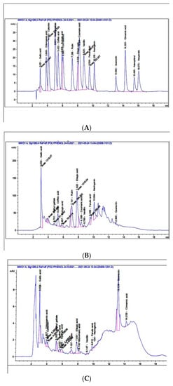 (A). HPLC Chromatogram of phenolic compounds reference material (standards), (B). HPLC Chromatogram of phenolic compounds in methanolic leaves extract of Z. spina-christi, (C). HPLC Chromatogram of phenolic compounds in methanolic fruits extract of Z. spina-christi.