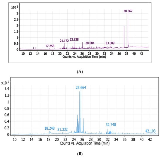 (A). GC-MS spectral chromatogram of Z. spina-christi leaves extract; (B). GC-MS spectral chromatogram of Z. spina-christi fruits extract.