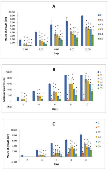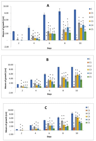 Antifungal activity of leaves extracts of Zizyphus spina-christi L. against (A) A. alternata, (B) A. citri, and (C) A. radicina at different concentrations: C is control, C1 Mancozeb, C2 50 mg/mL, C3 100 mg/mL, C4 150 mg/mL, and C5 200 mg/mL. Values are means of three replicates ± standard deviation. Statistical significance of differences compared to control: * Significant at p > 0.05, ** Significant at p < 0.01 according to Duncan test.