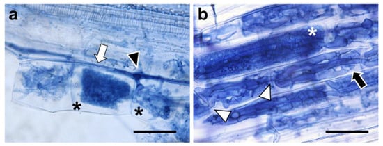 Depending mainly on the host plant species, the mutualism established results in either Arum- or Paris-type hyphal structures of intraradical AM fungi [26,27,28,29,30]. In Arum-type AM, AM fungal hyphae elongate in the apoplastic space of plant cells and form arbuscules in the cortical cells. Paris-type AM is characterized by intracellular hyphal elongation and hyphal coils in the host cortical cells. Despite the distinct AM morphologies, the reasons why AM morphotypes vary among host plants has been unclear. In addition, how host plants differentially regulate AM symbioses for each AM morphotype is not fully understood.
