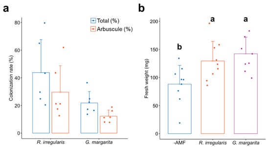 Quantification of AM fungal colonization rates and AM-promoted shoot growth of tomato plants. (a) The fungal colonization rates of Rhizophagus irregularis or Gigaspora margarita in tomato roots at five weeks post-inoculation (wpi). Total (%), the percentage of all hyphal structures observed in the tomato roots; arbuscule (%), the rate of arbuscules formed in the cortical cells. There is no statistically significant difference in the colonization rates between R. irregularis and G. margarita in Welch’s t-test. The error bars show the standard errors (n = 6). (b) The shoot fresh weight of tomato colonized by R. irregularis and G. margarita at five wpi. AMF, non-colonized tomato roots; R. irregularis, R. irregularis-colonized roots; G. margarita, G. margarita-colonized roots. The bars and dots indicate the average and individual values, respectively. The error bars indicate the standard errors (n = 9). The different letters indicate statistical significance (p < 0.05) in analysis of variance (ANOVA) with a post hoc Tukey-Kramer test.