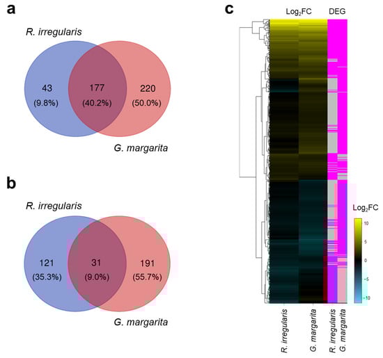 Differential expression analysis of tomato roots colonized by Rhizophagus irregularis or Gigaspora margarita. (a,b) Venn diagram of 440 AM-upregulated (a) and 343 AM-suppressed (b) genes compared with non-colonized roots at five weeks post-inoculation (wpi). Genes with |Log2Fold Change (FC)| > 1 and a false discovery rate (FDR) < 0.05 were considered differentially expressed genes (DEGs). (c) Hierarchical clustering of the total AM-responsive DEGs. The left-hand heatmap shows the Log2FC of genes expressed in colonized tomato roots relative to non-colonized roots. Blue indicates negative values; yellow, positive values; and black, zero change. The right-hand heatmap illustrates FDR values less than 0.05, with significant DEGs presented in pink. Detailed information about the DEGs can be found in Table S2.