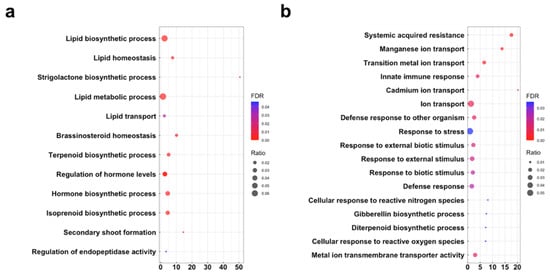 Gene ontology (GO) enrichment analysis was conducted to gain insight into how tomato plants respond to the associating AM fungi (Figure 4, Table S3). Since half of AM-upregulated DEGs was shared between R. irregularis- and G. margarita-colonized roots, we first examined the enriched GO terms in the common DEGs. We found that some GO terms related to the lipid biosynthesis and transport, and SL production was significantly enriched during association with both AM fungi (Figure 4a). On the contrary, AM-upregulated DEGs specific to G. margarita had enriched GO terms related to immune response, such as the response to biotic stimuli, systemic acquired resistance, and cellular response to reactive oxygen (Figure 4b). Interestingly, GA biosynthesis in tomato roots was also transcriptionally upregulated upon G. margarita infection. Since the number of DEGs unique to R. irregularis was not sufficient for enrichment analysis, the GO terms were not analyzed.
