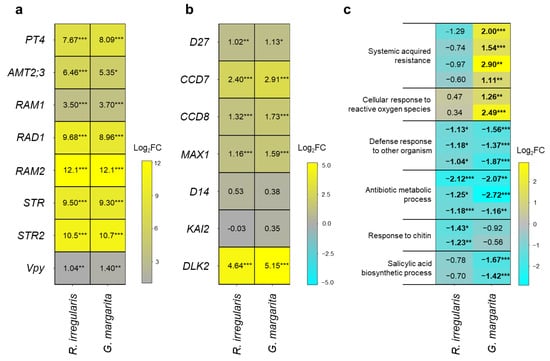 Expression patterns of AM-, strigolactone (SL)-, and defense-related genes during AM symbioses established by different AM fungi in tomato roots. At five weeks post-inoculation (wpi), the transcriptional response of the selected tomato genes against Rhizophagus irregularis or Gigaspora margarita colonization was analyzed. Log2-transformed fold changes (FC) of AM-related (a) and SL-related (b) genes versus the non-colonized roots are presented in each left-hand heatmap. (c) The expression patterns of DEGs involved in the defense-related pathways (Figure 4b, Table S3). The calculated values are written on the heatmaps. The Log2FC values of DEGs are shown in bold. Asterisks indicate the significance in the Log2FC (*: false discovery rate (FDR) < 0.05, **: FDR < 0.01, and ***: FDR < 0.001). The Log2FC and FDR values are listed in Table S4.