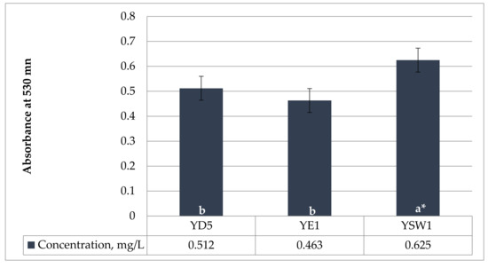 Production of indole-3-acetic acid (IAA) in YPD medium, with 0.1% (w/v) L-tryptophan, incubated in a shaker at 30 °C and 150 rpm for 5 days. a and b indicate statistical references, * indicates high significance.