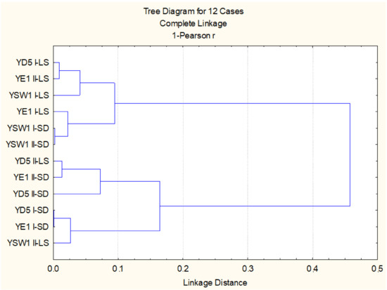 When regarding the effect of leaf spraying versus root drench and the effect of single treatment versus duplicate treatment, the statistical evaluation of all studied biometric and physiological parameters highlighted that, for the Z. bailii YE1 strain, the most effective is twofold foliar inoculation, while for S. cerevisiae YD5, it is single soil and single leaf treatment, and for the S. kudriavzevii YSW1 strain, it is twofold soil treatment (p < 0.05). Cluster analysis based on studied parameters confirmed that the experimental variants with duplicate leaf spraying of S. kudriavzevii YSW1 and S. cerevisiae YD5 strains are not similar to the leaf-inoculated tobacco plants (Figure 3). Two main groups are formed, the first one combining the three strains applied through foliar spraying and two soil treated S. kudriavzevii YSW1 variants, where a higher stimulatory effect was observed. The second group consists of the rest soil drenched yeast strains and twofold leaf-sprayed S. cerevisiae YD5 and S. kudriavzevii YSW1 strains, where the enhancement was less pronounced (p < 0.05).