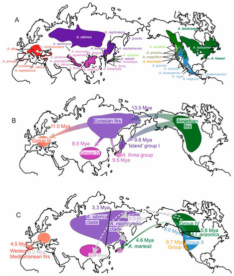 Distribution and colonization history of Abies species, suggested on the basis of mtDNA phylogeny (this study) and taking into account the results of biogeographic study based on nuclear DNA data [10]. The events of migration and isolation are presented with an age estimate. Recent and ancestral taxa are color-coded according to the nuclear DNA-based groups [10]. Additionally, the proposed migrations associated with introgressive hybridization and capture of mitochondrial genome of native species by migrants are indicated (dashed gray line). (A) Present species ranges; (B) Before 8 million years ago (Mya); (C) After 8 Mya years ago.
