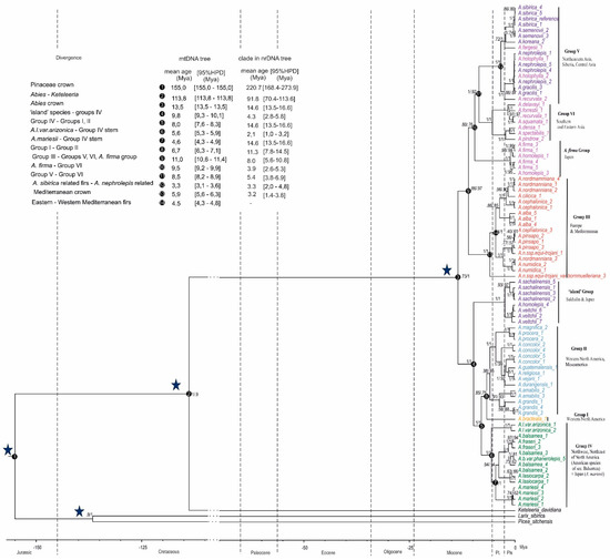 Previous biogeographic studies based on nuclear, chloroplast and mitochondrial DNA pointed to the American origin of modern Abies lineages and multiple migrations from North America to Eurasia [10,11] (Figure 1B,C). Additionally, it was shown that, in contrast to nuclear and chloroplast DNA, mitotypes of firs form two groups consisting of Eurasian and (predominantly) American species, probably due to the origin of mitochondrial genomes of Eurasian firs being the result of primary colonization from North America. Presumably, during subsequent migrations from North America, migrant species captured the mitochondrial genomes of aboriginal species through introgressive hybridization which explains the presence of phylogenetically related mitotypes in unrelated groups of Eurasian species. The mitotype tree, however, had a low resolution. In particular, the main groups of mitotypes within the American and Eurasian branches were not supported, and the position of the outgroup was not resolved.