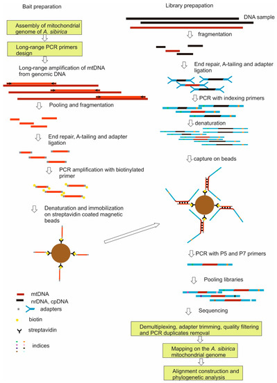 Genomic libraries were prepared from 95 DNA samples of 42 Abies taxa out of 47 species of fir identified by [36], representing all major phylogenetic lineages and previously used in a phylogenetic study [10] and a sample of Keteleeria ortune (A. Murray) Carrière (Table S1). To enrich the libraries by mtDNA, the target-enrichment strategy with hybrid capture was used [9] as shown in the diagram (Figure 3). Laboratory procedures were based on techniques of [34,35,37,38]. Their detailed description is presented in the Laboratory Protocols (Supplementary Materials).