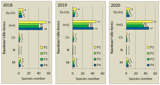 Life-form spectra of species in the four plots (P1–P4) of “Pócalja” Natura 2000 loess grassland (Central Hungary), in years 2018, 2019 and 2020. Th = therophytes, TH = hemitherophytes, H = hemicryptophytes, G = geophytes, Ch = chamaephytes, N = nanophanerophytes, M = phanerophytes.