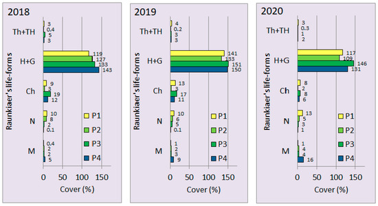 Life-form spectra based on species’ cumulative percentage cover values in the four plots (P1–P4) of “Pócalja” Natura 2000 loess grassland (Central Hungary), in years 2018, 2019 and 2020. Th = therophytes, TH = hemitherophytes, H = hemicryptophytes, G = geophytes, Ch = chamaephytes, N = nanophanerophytes, M = phanerophytes.