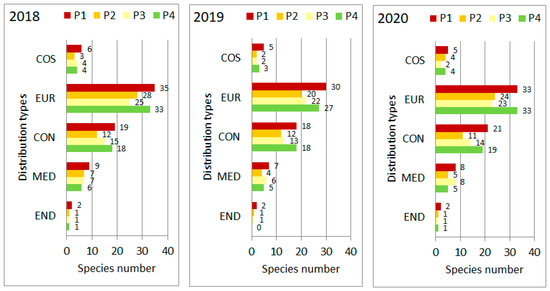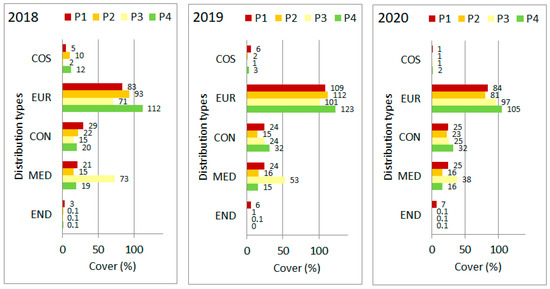 Share among distribution range types of species in the four plots (P1–P4) of “Pócalja” Natura 2000 loess grassland (Central Hungary), in years 2018, 2019 and 2020. COS = cosmopolitan, EUR = European, CON = continental, MED = Mediterranean, END = endemic.
