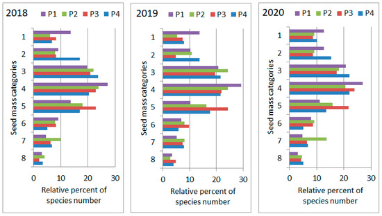 Distribution of species along seed weight categories in the four plots (P1–P4) of “Pócalja” Natura 2000 loess grassland (Central Hungary), in years 2018, 2019 and 2020.
