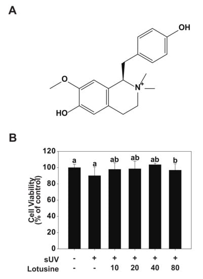 Effect of lotusine on HaCaT cell viability. (A) Chemical structure of lotusine. (B) MTT assay results showed that lotusine does not exhibit cytotoxicity up to a concentration of 80 µM. Means with different letters (a,b) within a graph significantly differ from each other at p < 0.05.