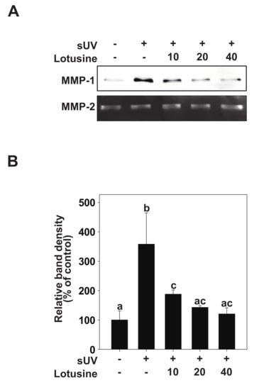 It has been suggested that sUV-exposed skin cells (fibroblasts, keratinocytes) can demonstrate aging biomarkers such as DNA damage and cell cycle arrest, potentially elevated due to excessive MMP secretion [8]. sUV induces the synthesis and expression of MMP-1 in the human epidermis, which breaks down fibrin collagen and plays an important role in photoaging [9]. To determine the inhibitory effect of lotusine on MMP-1, the inhibitory effect on sUV-induced MMP-1 protein expression was evaluated in HaCaT cells. sUV irradiation (25 kJ/m2) was performed after pretreatment with lotusine. After 48 h, MMP-1 protein secreted from the culture medium was analyzed by Western blotting. These results revealed that MMP-1 protein expression increases following sUV irradiation, and lotusine decreased MMP-1 expression. MMP-2 was used as a loading control (Figure 2A,B).