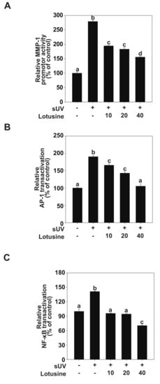 AP-1 and NF-κB are major transcription factors involved in UV-induced MMP-1 expression [24]. We evaluated MMP-1 transcriptional activity and transactivation of AP-1 and NF-κB to clarify how lotusine regulates MMP-1 expression following sUV irradiation. The luciferase reporter gene analysis revealed that sUV irradiation increased the MMP-1 promoter activity level by 279% (Figure 3A). Treatment with lotusine decreased sUV-induced MMP-1 transcriptional activity. sUV-induced AP-1 transactivation increased by 190%, and treatment with 40 µM lotusine decreased this activity when compared with the untreated control (Figure 3B). The sUV-induced NF-κB transactivation was increased by 141%; treatment with 40 µM lotusine decreased this activity by 70% (Figure 3C). Therefore, we postulate that lotusine inhibited sUV-induced MMP-1 transcription by inhibiting NF-κB and AP-1 transactivation.