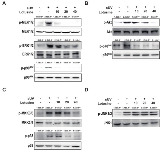 Lotusine suppresses solar ultraviolet (sUV)-induced MEK1/2-ERK1/2-p90RSK, MKK3/6-p38, and Akt-p70S6K pathways in HaCaT cells. (A) and (B) Effect of lotusine on sUV-induced phosphorylation of the MEK1/2-ERK1/2-p90RSK and Akt-p70S6K signaling pathway. (C) and (D) Effect of lotusine on sUV-induced phosphorylation of the MKK3/6-p38 and JNK1/2 signaling pathways. Phosphorylation and total protein levels were analyzed by Western blotting. Relative band strength is indicated by the folding of the control and at the top of each band using Image Studio software (LI-COR). Different letters (a–d) significantly differ (p < 0.05) according to Duncan’s multiple range test.
