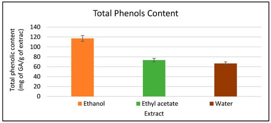 Ethanol extract revealed the highest gallic acid equivalent amount (GAE) with a value of 117.13 mg/g, followed by ethyl acetate extract with 73.44 mg/g. in comparison, water extract revealed the lowest phenolic amount (GAE) with a value of 66.6 mg/g (Figure 1). Standard curve found in (Figure S1).