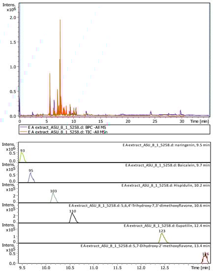 LC-MS Chromatogram obtained from A. citrodora ethyl acetate extract. A total of six identified compounds was revealed: Naringenin, 5,6,4′-Trihydroxy-7,3′-Dimethoxyflavone, Hispidulin, Eupatilin, Baicalein, and 5,7-Dihydroxy-2′-Methoxyflavone.