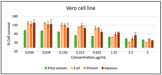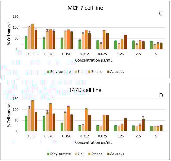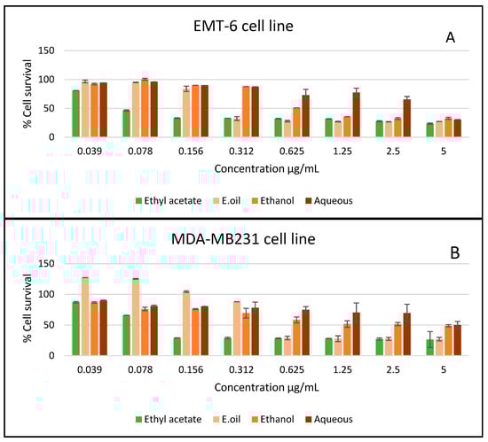 In vitro antiproliferative activity of different extracts of A. citrodora was tested on five cell lines (EMT-6, MCF7, MDA-MB231, T47D, and Vero), and the obtained IC50 (µg/mL) results showed promising anti-proliferation potential (Table 5). By far, ethyl acetate extract was the most active on all cell lines, followed by the essential oil and ethanol extract. On the other hand, the aqueous extract did not exhibit activity on all the tested cell lines (Figure 3).